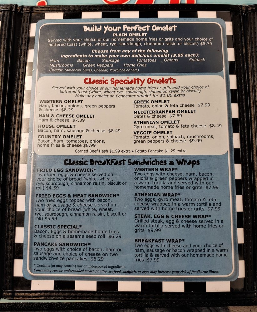 Served with your choice of our homemade home fries or grits and your choice of buttered toast (white, wheat, rye, sourdough, cinnamon raisin, biscuit or roll).