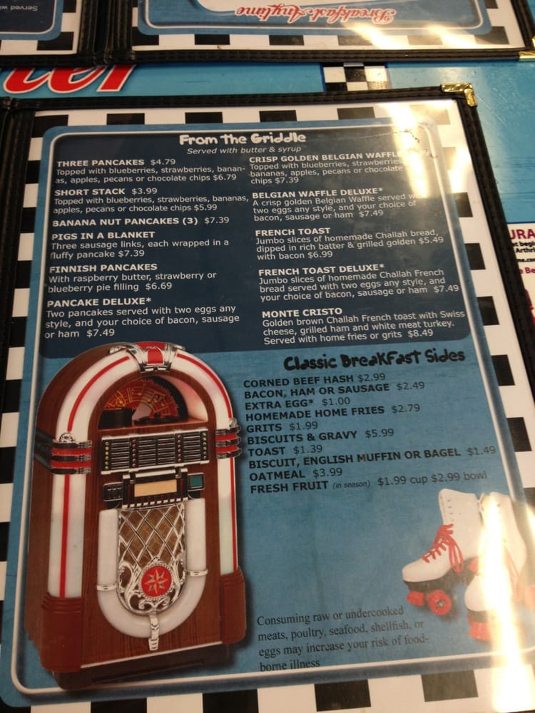 Bacon, ham or sausage and cheese with 2 eggs on 2 sandwich sized pancakes.